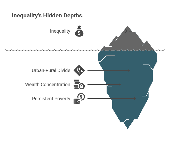 However, the urban-rural divide remains wide, with rural areas still facing limited access to quality education, healthcare, and employment. Wealth concentration in cities contrasts sharply with widespread poverty and informal settlements.